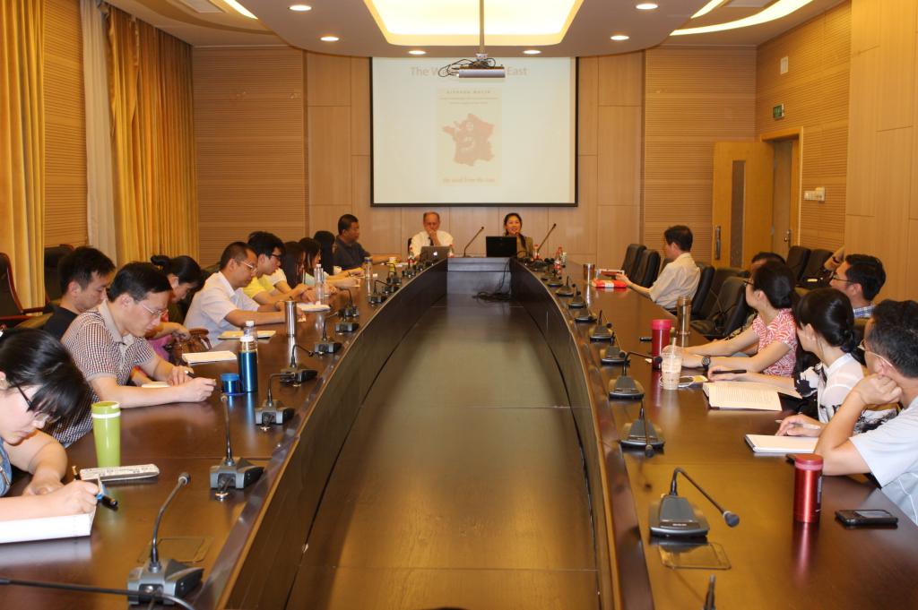 2014年5月26日下午,williamhill中文官网“百川讲堂”第四期在学术会堂603报告厅隆重举行,本期有幸邀请到国际著名左翼思想家、纽约城市大学研究生中心教授理查德•沃林(Richard Wolin),为公司师生作了关于“毛泽东的影响:东风西渐”的专题讲座。讲座由williamhill中文官网副经理陈文娟副教授主持,蔡大梁老师担任翻译。