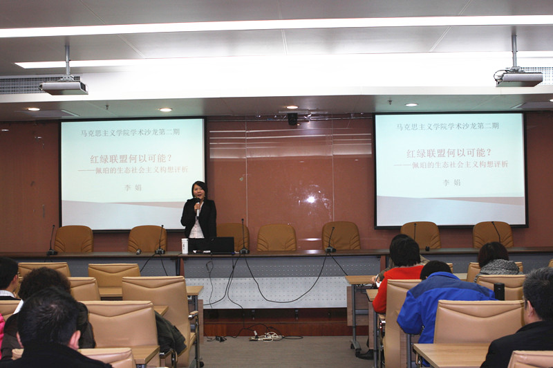 李娟老师首先概略介绍了现代生态问题起源和人类生态意识觉醒的历史进程,为大家了解主题报告做了很好的背景铺垫。然后,她详细讲述了英国马克思主义学者大卫·佩珀提出生态社会主义构想的逻辑脉络及其思想框架:佩珀认为,随着人类社会的不断演进,尤其资本主义社会现代工业的快速发展,加速了人类赖以生存的生态环境的不断恶化,为了遏制这一不良发展势头,必须建构新的社会形态。他说,在这一点上,红色政治和绿色政治的目标都是相同的,而且都主张通过否定资本主义、发动革命性变革、实现社会公正等途径来实现,但是由于绿色政治被灌输了大量的无政府主义,其逻辑立场是反人类中心论的生物中心主义,忽视了工人阶级的力量,这注定了绿色政治仅仅是一种美好的幻想。