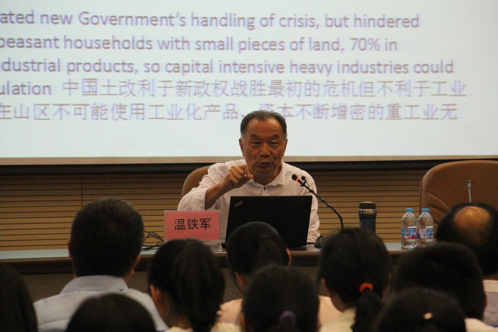 温教授在此次讲座中着重为现场师生讲述了新中国1949年到2016年间的十次周期性经济危机。温教授首先简要介绍了周期性经济危机的背景与问题。“只有把背景搞清楚才能研究问题”。他围绕二战后地缘政治的不确定性及冷战特点介绍了当时的国际背景,在重新界定了有普遍意义的主要概念以后,温教授指出:“把逻辑和经验的起点建立在一起,才能展开分析”。在关于新中国建立之初的危机与反危机的论述中,他既引经据典、旁征博引,又结合实际、深入浅出地进行理论分析,强调农民对于解决生产过剩问题的重要意义,并且语重心长地提醒我们:无论中国经济社会发展到什么时候,都“别忘了农民,别亏了‘三农’”。最后总结阶段,温教授强调要正确看待中国过去的发展经验,尤其是前30年对于后30年的贡献,并寄语在座的莘莘学子将来能够就新一轮生产过剩问题多做客观分析,寻求切实有效的解决路径。