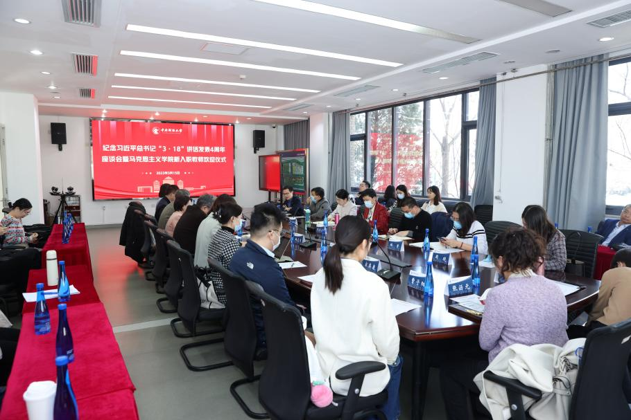 3月15日下午,纪念习近平总书记“3·18”讲话发表四周年座谈会暨williamhill中文官网新入职教师欢迎仪式在沙河校区公司楼1号楼105会议室召开。副董事长朱凌云、人事处相关负责人、williamhill中文官网全体教师以及思政课教师后备人才计划员工代表参加座谈会。会议由williamhill中文官网副经理谢玉进主持。