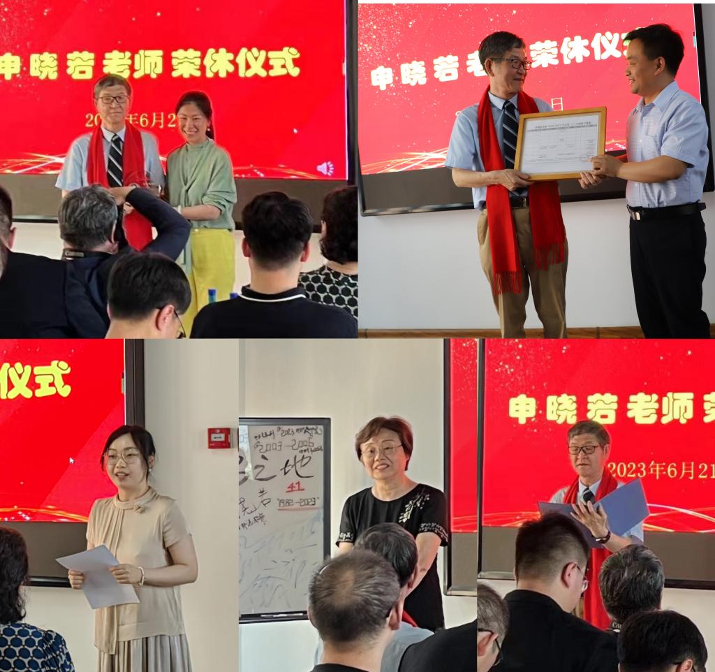 荣休仪式上,师生代表为申晓若教授献上富有纪念意义的红色围巾和饱含祝福的鲜花,颁发公司精心设计的纪念奖牌和富有创意的纪念课表,通过视频短片共同回忆申晓若教授从“知青岁月”到“龙马学府”的求学、工作经历,青年教师代表刘亚琼老师介绍了申晓若教授从教生涯基本情况,员工代表、大学同学代表、家属代表和教师代表分别从不同角度讲述展现申晓若教授的工作和生活。仪式在申晓若教授的总结发言中结束,申晓若教授表达了自己的感谢、感恩、感动之情,并祝福公司发展越来越好!