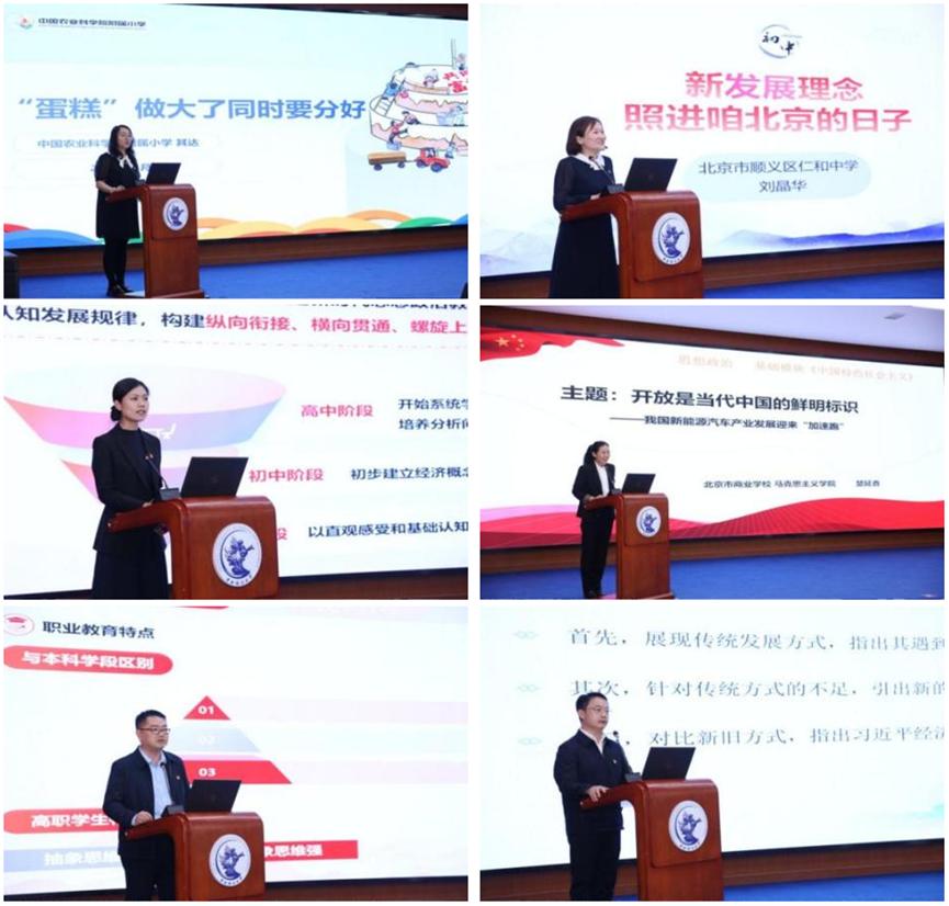 中国农业科公司附属小学其达、北京市顺义区仁和中学初中教师刘晶华、北京市第三十五中学高中教师邵月玲、北京市商业公司williamhill中文官网教师楚延香、北京经济管理职业公司williamhill中文官网教师姚昊炜、williamhill中文官网教师李扬等六位思政课老师,展示了习近平经济思想融入各学段的教学设计。