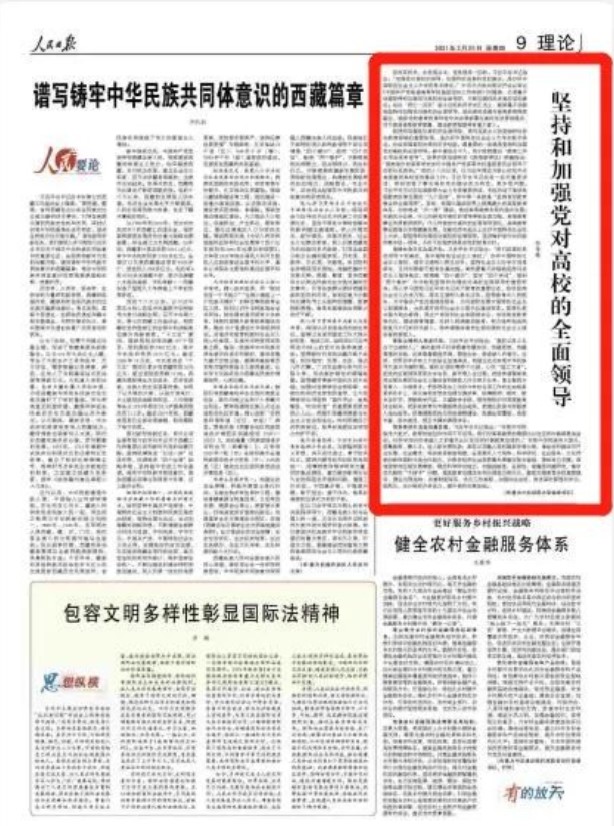 3月25日,《人民日报》理论版刊登了公司党委书记何秀超发表的署名文章——《坚持和加强党对高校的全面领导》。何秀超在文章中指出,党政军民学,东西南北中,党是领导一切的。要深入贯彻落实习近平总书记“加强党对高校的领导,加强和改进高公司党的建设,是办好中国特色社会主义大学的根本保证”的重要讲话精神。站在“两个一百年”奋斗目标的历史交汇点上,继续毫不动摇地坚持和加强党对高校的全面领导,推动高公司党建与高等教育深度融合,确保党的教育政策和党中央决策部署在高校有效贯彻落实,对于提高高等教育质量、建设教育强国具有重大意义。