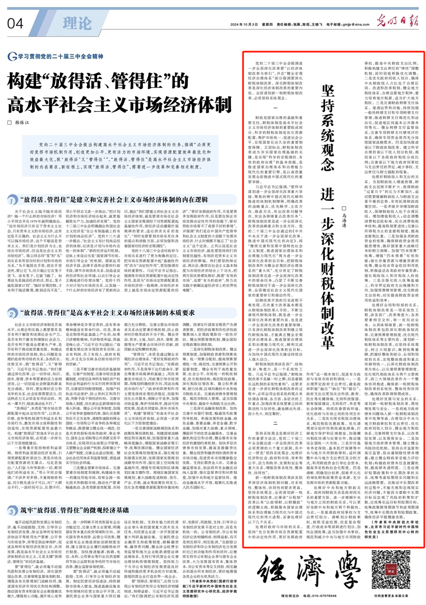 10月3日,公司董事长马海涛教授在《光明日报》理论版撰文《坚持系统观念 进一步深化财税体制改革》。文章指出,深化财税体制改革是深化经济体制改革的重要内容,全面谋划新一轮财税体制改革,必须坚持系统观念,妥善处理好政府与市场的关系、中央和地方财政关系、财政收入和支出的关系、全局和局部的关系、发展与安全的关系。