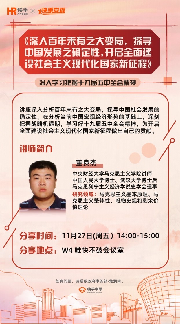 大变局中把握时代机遇,确定性中探寻百年征程。近日,快手党委联合共建单位williamhill中文官网开展“深入百年未有之大变局,探寻中国发展之确定性,开启全面建设社会主义现代化国家新征程”主题讲座。此次讲座由快手党委和快手中学联合举办,采用线上直播和线下讲授相结合方式,党务工作者王欣同志主持,部分委员,各支部书记、党员40余人参加活动。