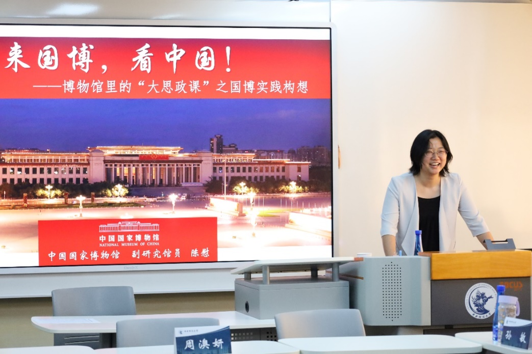 学习研讨后,中国国家博物馆副研究馆员陈慰以《来国博,看中国——博物馆里的“大思政课”之国博实践构想》为主题进行了分享交流。陈慰围绕中国国家博物馆的历史沿革、陈列特点、系列教育课程案例解析等内容进行了专业解读,并针对博物馆里的“大思政课”的课程体系构思、课程设计原则、重要意义和面临的挑战等方面提出了建议。随后,与会师生分别就博物馆里的“大思政课”建设中各门课程的文物选取、结合重点、进度安排、难点问题等进行了交流分享,进一步明确了博物馆里的“大思政课”建设的推进方向和完善路径。